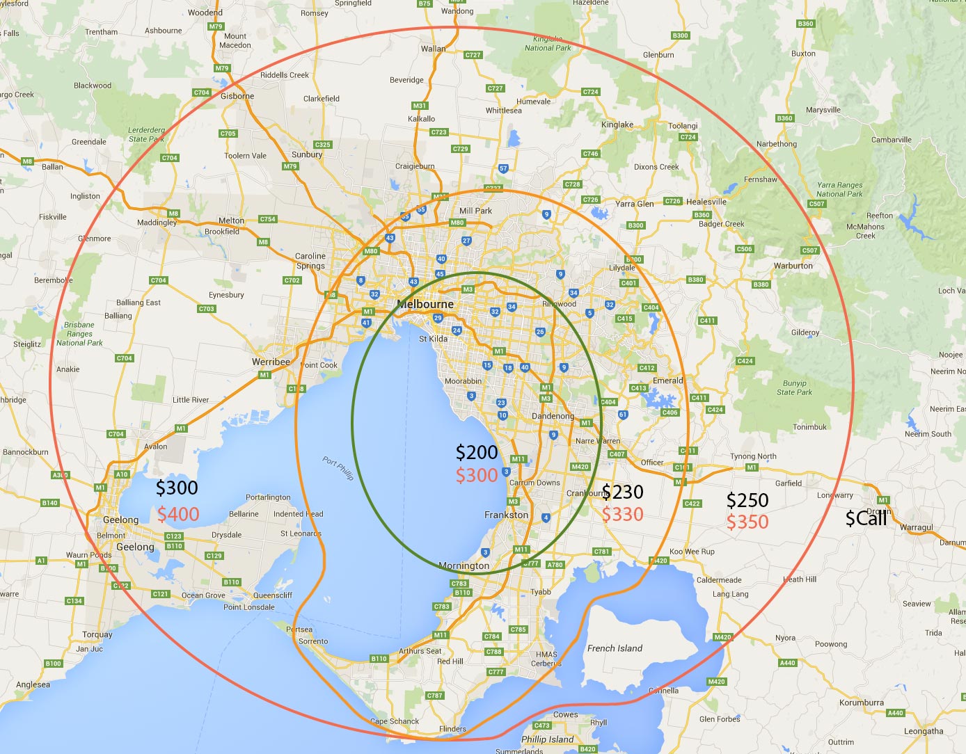 Grand Piano Delivery and Pickup Costs (In Orange) Green zone $300, Orange Zone $330, Red Zone $350-$400.